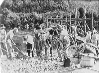 Decupagem:  PC com movimento de câmera de um tronco de árvore gigantesco. Colonos usam machado para cortá-lo em vários pedaços.