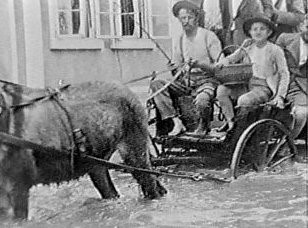 Decupagem:  PC de mulher alimentando um porco, família de colonos posa nos fundos.