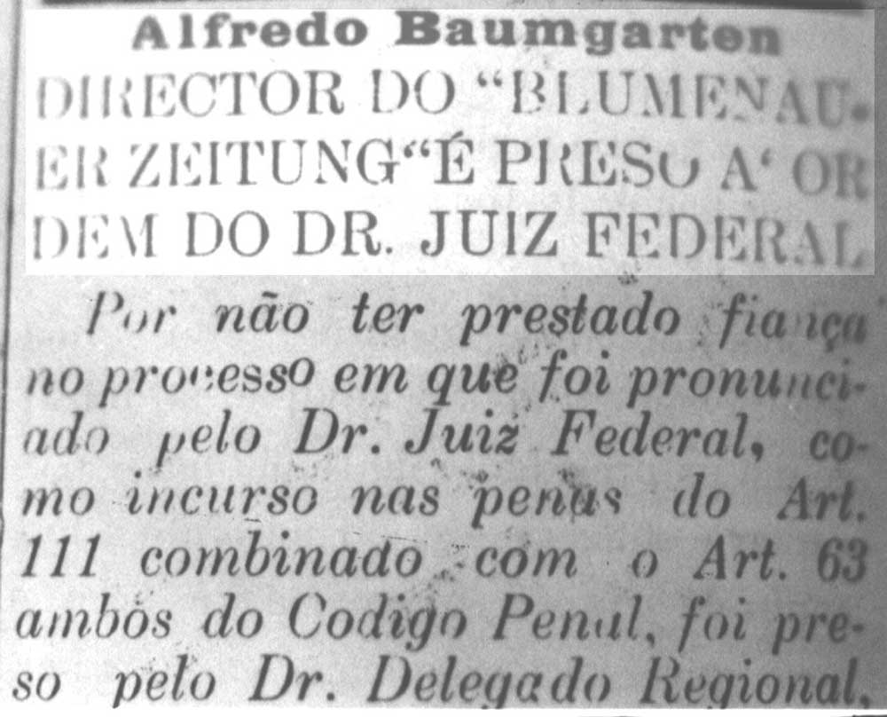 Armando Luiz Medeiros conta que seu avô era um homem de personalidade forte, e a defesa firme de suas posições o levou por duas vezes à prisão. A primeira, no dia 25 de setembro de 1920 , por não revelar o autor de inflamado artigo em defesa dos padres franciscanos publicado em seu jornal. A segunda prisão foi em função de sua participação na tentativa de tomada do poder pelos integralistas, em 1938. A missão de Baumgarten na fracassada missão, que lhe rendeu 12 semanas na cadeia, foi a de transmitir instruções pelo rádio.