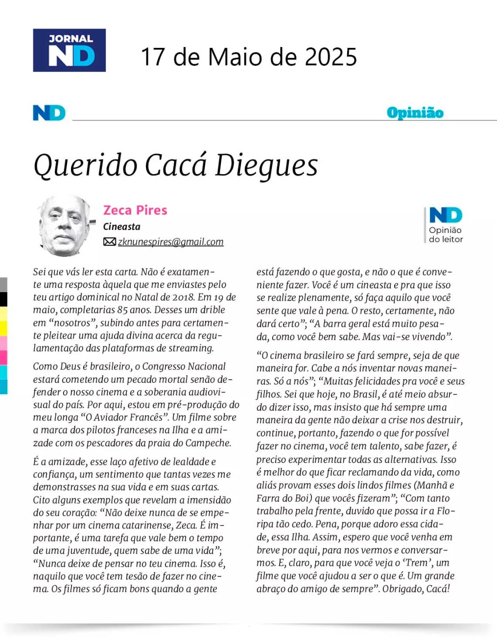 No dia 17 de maio de 2025, o Jornal ND trouxe um texto que transcende o papel. Uma carta emocionada, escrita pelo cineasta catarinense Zeca Pires, dirigida a um dos maiores nomes do cinema brasileiro: Cacá Diegues.