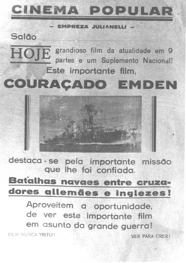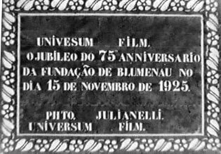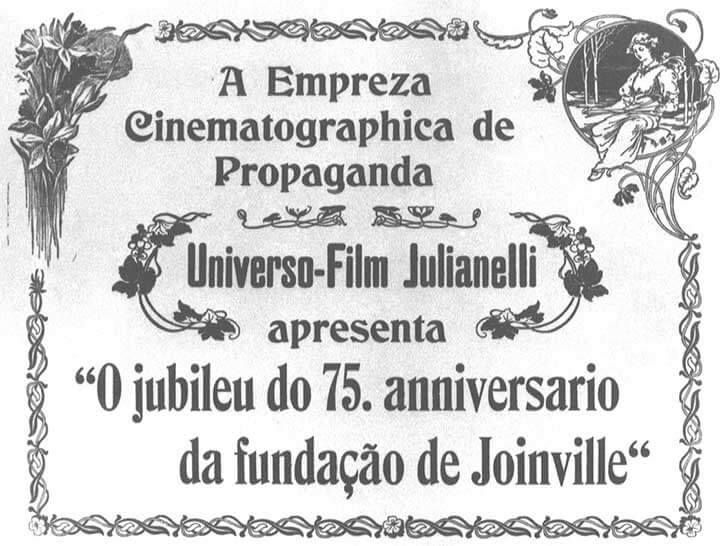 Texto: Acha-se, nesta capital o sr. José Julianelli, proprietario e operador do Cine Photographico Universo Film, de Blumenau, empreza de propaganda industrial, cultura, commercio e lavoura. O sr. Julianelli vem exhibir nesta capital os importantes films, em 6 partes do florescente municipio de Blumenau, recem-tirados.