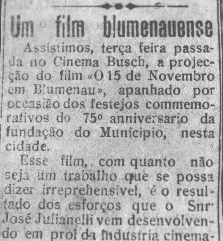 Título: Films de Blumenau. Texto: O sr. Julianelli, habil operador cinematographico, tirou, durante a excursão do Dr. Adolpho Konder á Blumenau, varios aspectos daquelle municipio. Esses aspectos filmados foram ali exhibidos, causando excellente impressão. Por estes dias o sr. Julianelli exhibirá nesta capital os films de Blumenau por elle organisados.