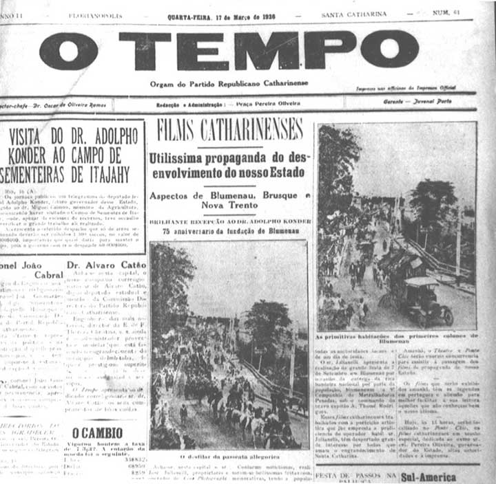 A exhibição dos films catharinenses causou excellente impressão e constitue uma admiravel surpreza para os que conhecem Blumenau, Brusque e Nova Trento.
