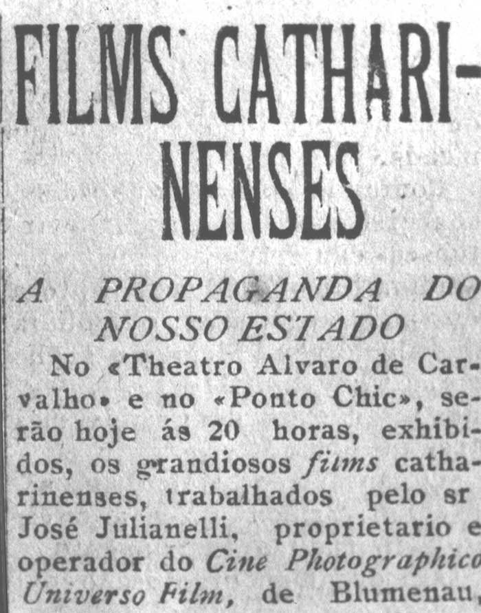 Texto:  No Theatro Alvaro de Carvalho e no Ponto Chic, serão hoje ás 20 horas, exhibidos, os grandiosos films catharinenses, trabalhados pelo sr. José Julianelli, proprietario e operador da Universo Film, de Blumenau, empreza de propaganda da nossa industria, da nossa lavoura, do nosso commercio, etc.