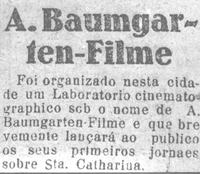 “Foi organizado nesta cidade um Laboratório cinematgraphico sob o nome de A. Baumgarten-Filme e que brevemente bancará ao público os seus primeiros jornaes sobre Santa Catarina. Esta importante organização está filiada à Distribuidora de filmes Brasileiros e seus filmes serão completamente synchronisados, isto è, musicados e fallados, constituindo por isso um verdadeiro orgulho para Blumenau. No estado é a primeira que se forma, não se precisando salientar a sua relevancia, creação esplendida de seus organizadores. Teremos assim o optimo meio de demonstrar ao Brasil inteiro o progresso de nosso município e de nosso Estado, sendo por isso mesmo um meio valoroso para a propaganda de nossas industrias. O 1° filme da A. Baumgarten-filme, o Primeiro Congresso Meridional Integralista, já conseguiu a crítica favorável em todos os lugares em que foi filmado, representando um início bastante promissor e que muito garante para um feliz sucesso. Aos seus organizadores apresentamos nossa felicitações por mais esta optima contribuição para o progresso blumenauense”.