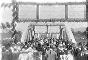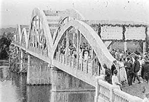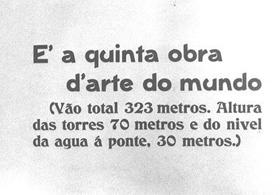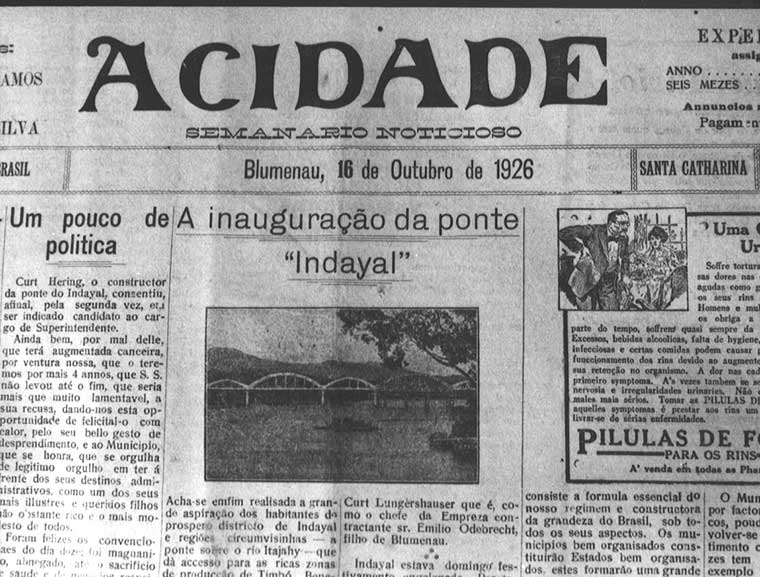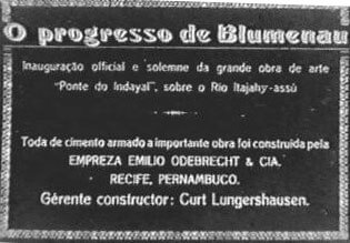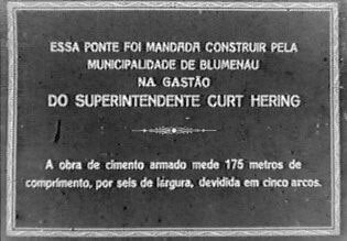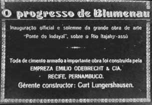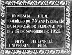 A ponte foi inaugurada num domingo festivo, dia 10 de outubro de 1926. Populares e muitas autoridades estiveram presentes ao evento. E é para eles, principalmente as autoridades, o olhar e o destaque do filme de Julianelli, intitulado Progresso de Blumenau. Trata-se de um típico “Jornal Cinematográfico”, ressaltando a ponte, o evento inaugural, os construtores, o discurso do ministro da viação, Victor Konder, os mergulhadores que trabalharam na construção da ponte, e uma regata disputada entre dois clubes locais. É interessante notar uma pequena estrutura: primeiro Julianelli mostra a ponte momentos antes da inauguração, o engenheiro aponta para trás, e, em seguida, no próximo plano, o autor mostra uma placa da ponte com os dizeres: “Esta ponte é o symbolo da fortaleza do nosso sentimento communal”. Isso significa que o cinegrafista fez algumas colagens para a apresentação final do jornal, colocando intertítulos e mostrando cenas seqüenciais, como esta do engenheiro. Os intertítulos e as imagens falam por si: