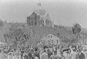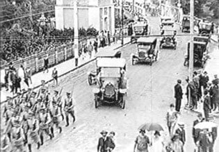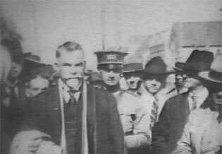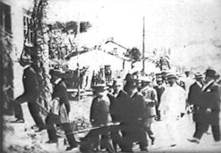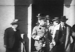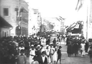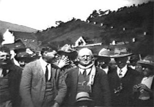 E m 1929, os dois cinegrafistas filmaram os festejos do centenário da colonização alemã na localidade de São Pedro de Alcântara. Em pouco mais de nove minutos de duração do filme de Julianelli, que desta vez surpreendentemente não possui intertítulos, quase metade é dedicada à filmagem de grupos de autoridades, desfiles oficiais, e a discursos de políticos. No tempo restante, são registrados os indispensáveis planos gerais do evento, que nos legam importantes recortes da época. Desta vez, Baumgarten filma um pouco mais. Suas imagens sobre o evento duram quase três minutos, nas quais estão incluídos três intertítulos. Em que pese esta diferença observada na ausência pouco comum dos intertítulos por parte do material de Julianelli, a principal distinção entre os dois cinegrafistas foi mantida também neste encontro ocorrido três anos após a filmagem da ponte de Indaial. Uma observação que pode passar despercebida para qualquer espectador desatento, mas que lhes é comum. A câmera de Baumgarten novamente registra o evento, documenta. O olhar de Julianelli é para as autoridades, os políticos, o poder.