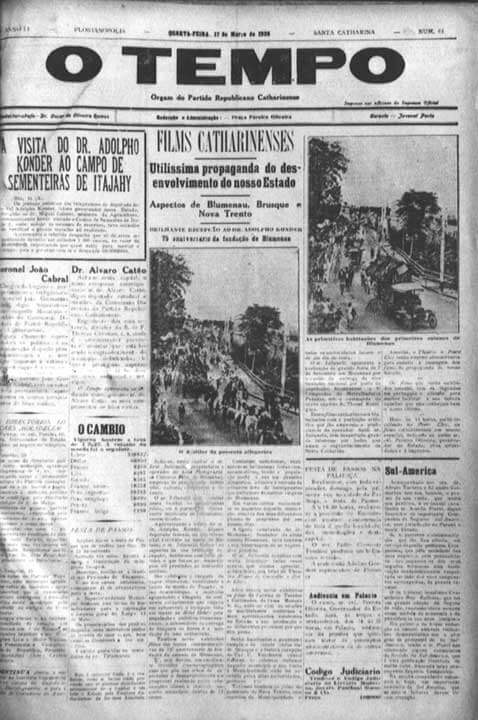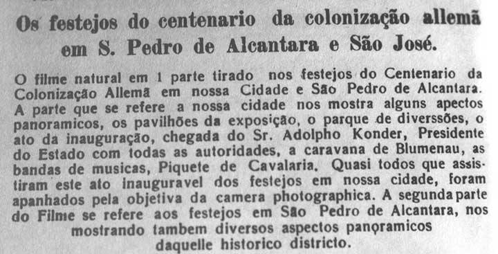 Os films, de hoje, constam conforme dissemos, hontem, de aspectos de Blumenau, Brusque e Nova Trento, exhibindo a chegada e recepção do dr. Adolpho Konder; as festas commemorativas do 75º anniversário da fundação de Blumenau, recem realisadas, aspectos industriaes e panoramas de todos aquelles municipios.