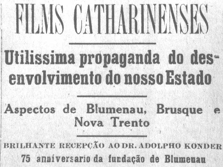 Título: Films Catharinenses - Utilissima propaganda do desenvolvimento do nosso Estado - Aspectos de Blumenau, Brusque e Nova Trento - Brilhante recepção ao Dr. Adolpho Konder - 75 anniversario da fundação de Blumenau