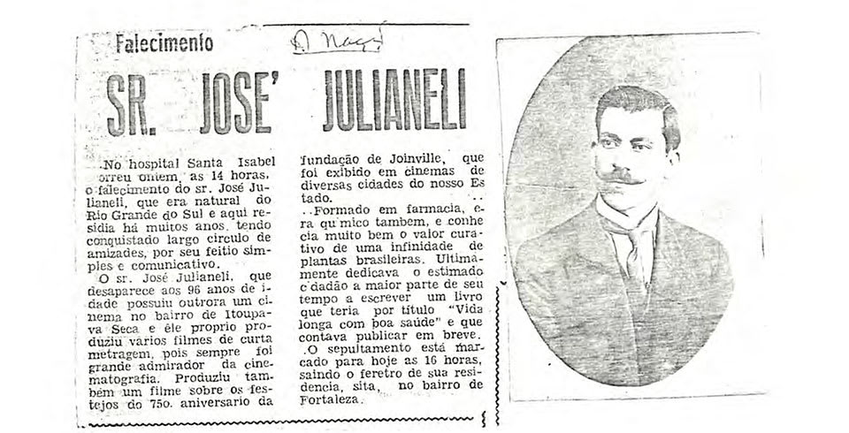 Já Julianelli sempre o encarou como fonte de renda. Desde o início do trabalho, como apêndice do circo de variedades e ambulante, até o período posterior, como cinegrafista. O produto dessa trajetória que mais nos interessa, os filmes, realizados em sua grande maioria nos anos 20 e, possivelmente, também na década seguinte, revelam imagens típicas dos jornais de variedades comuns naquela época, registrando os principais acontecimentos da região. É verdade que, no caso de Julianelli, os filmes que sobreviveram ao tempo mostram acontecimentos políticos, como: A chegada do Dr. Washington Luiz a Joinville, Setenta e cinco anos da fundação de Blumenau, A visita do Príncipe de Orleans e Bragança a Joinville (Joinville Jornal), O Progresso de Blumenau e outros.