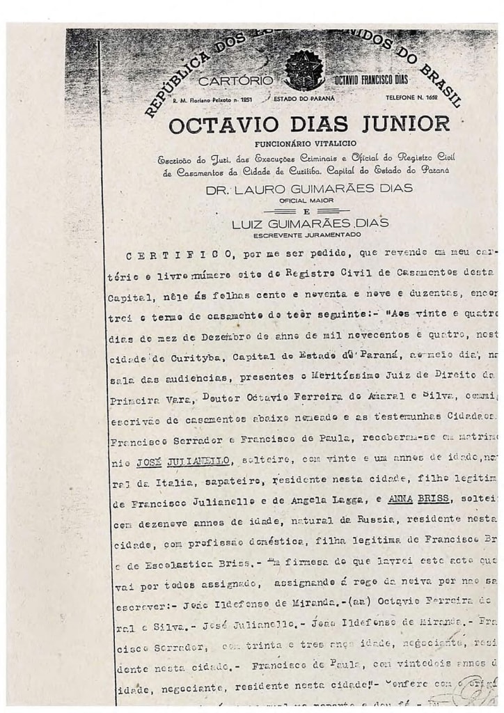 J ulianelli viajava freqüentemente para a cidade de Curitiba, a fim de rever amigos, anos depois, também para buscar fitas, e sempre aproveitava para fazer alguns bicos, como sapateiro. Lá, conheceu Anna Briss, natural da Rússia, com quem casou-se, no dia 24 de dezembro de 1904. Em seguida, o casal viajou com o circo para o Rio Grande do Sul, onde naturalizaram-se brasileiros. Do casamento com Anna Briss, Julianelli teve dois filhos: Ângela, que faleceu cedo, e Francisco, nascido no ano de 1915, e que, desde menino, acompanhou os passos do pai no circo e no cinema. Um pouco mais tarde, numa forma de indenização, Julianelli deixou o circo em Corupá-SC, para os artistas que nele trabalhavam.