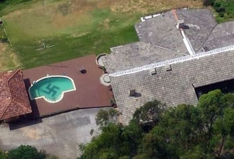 Imagem aérea mostra suástica nazista decorando fundo de piscina da casa de um professor de história, em Pomerode (SC). Acontecimento é citado no documentário “Anauê!” (crédito: Polícia Civil de Santa Catarina/Divulgação)